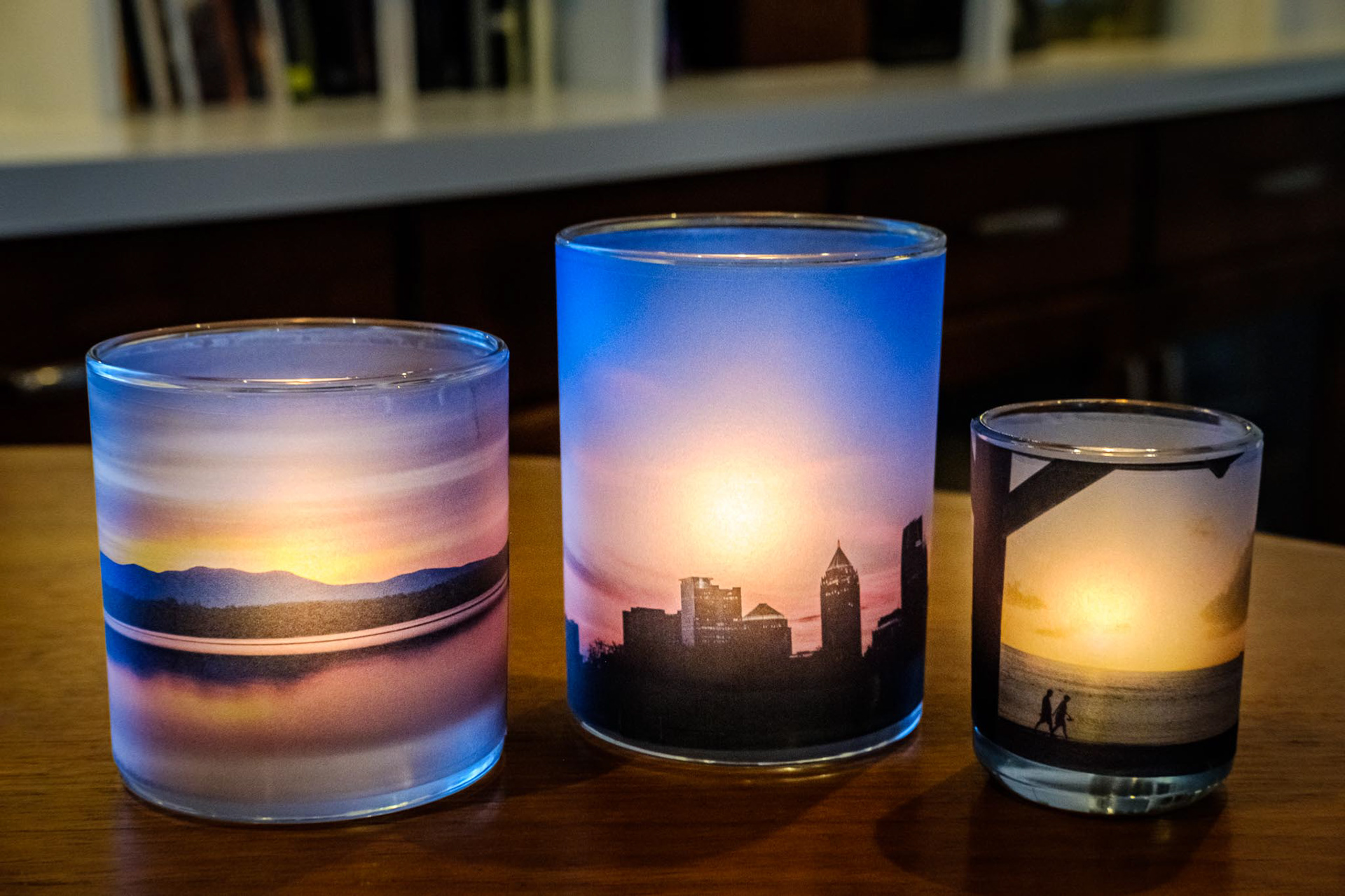 Using the light from a candle flame to simulate the sun, Time Ghost candle holders feature sunrise and sunset scenes from around the world. Time and location of each photo printed is on the bottom.